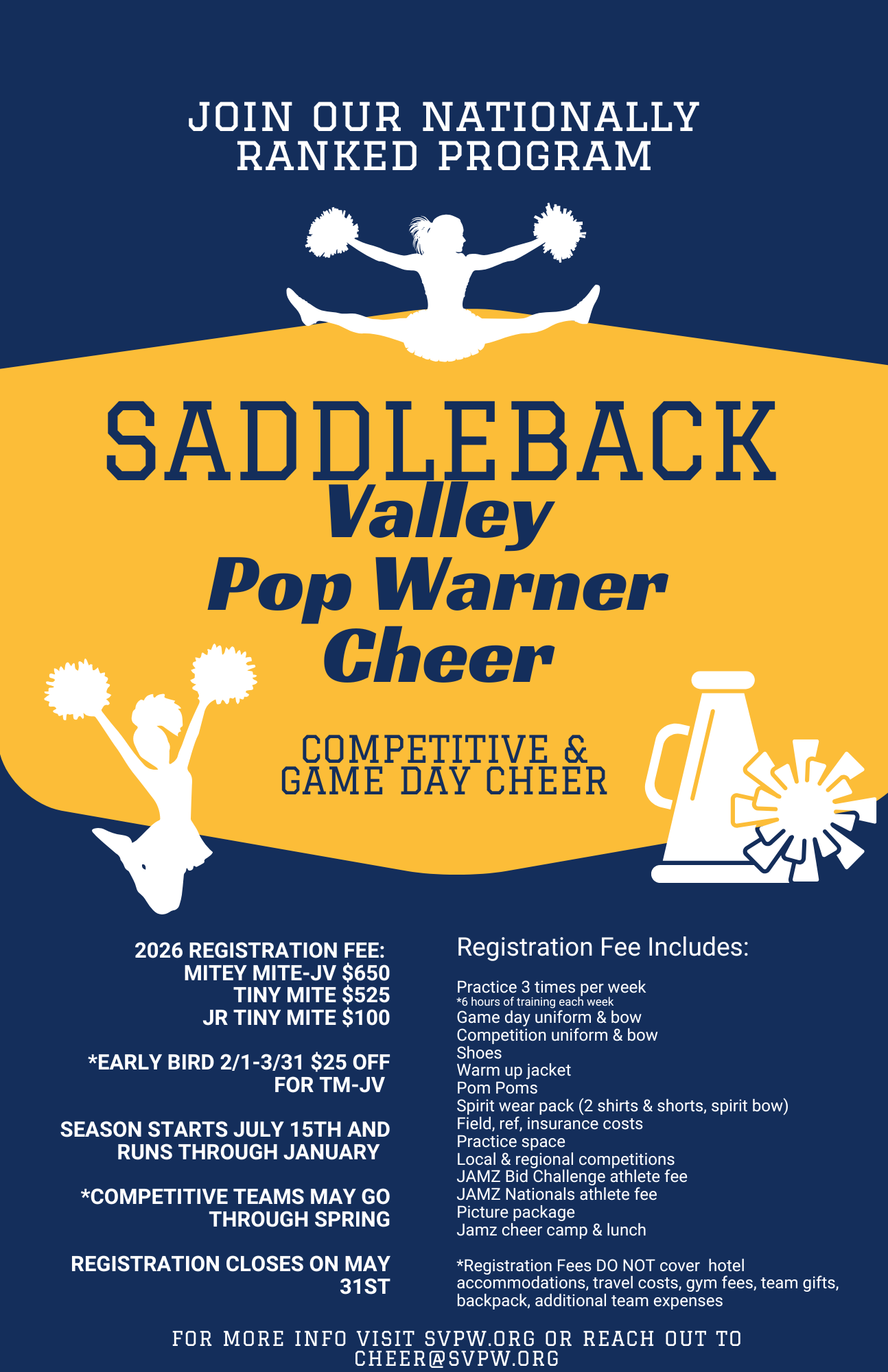 2. You must pick up registration paperwork at an SV in person event. Paperwork includes: physical (signed by a doctor), a copy of birth certificate, photo of participant and full year report card. You will need to return all completed paperwork before your cheerleader can participate. Only official Pop Warner forms will be accepted.